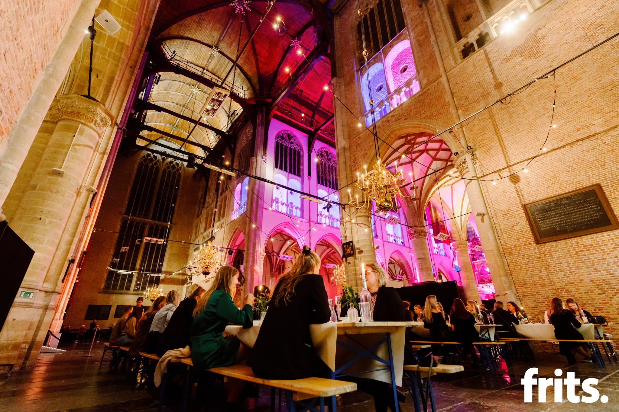 Je bent vanaf 18:00 uur welkom om direct vanuit werk binnen te lopen voor een borrel. Wil je de avond uitgebreider beginnen, dan kun je ook kiezen voor het Diner & Dans-arrangement: samen eten aan lange tafels in de kerk, voordat de muziek het overneemt en de vloer zich vult.